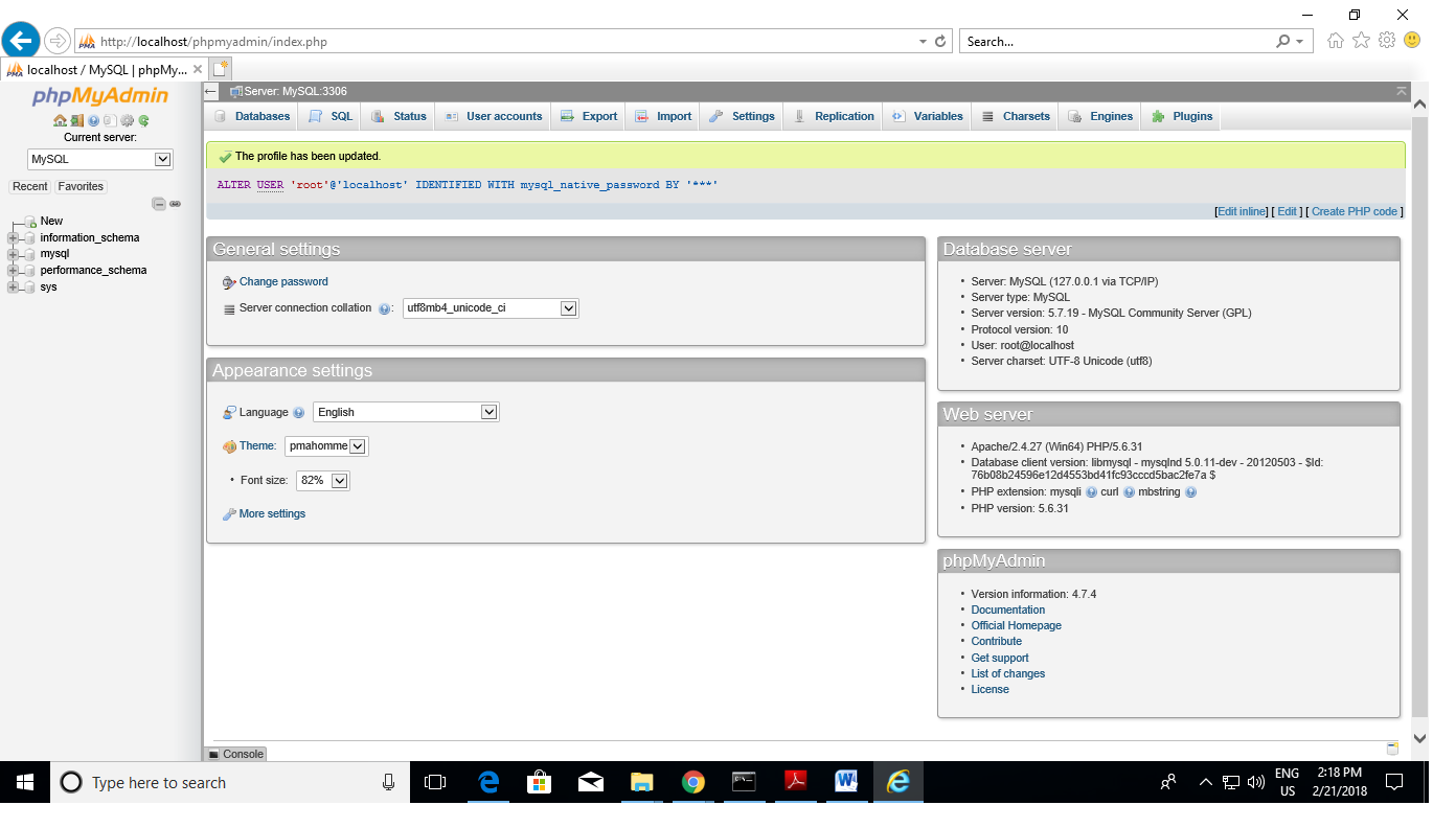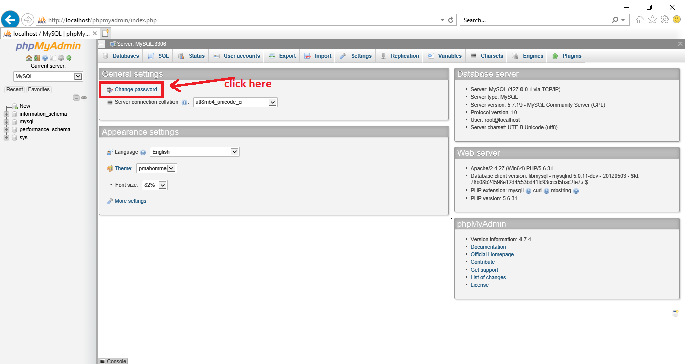 C:\wamp64\bin\mysql\mysql5.7.19\bin>mysql -u root -p Enter password: **************** Welcome to the MySQL monitor. Commands end with ; or \g. Your MySQL connection id is 29 Server version: 5.7.19 MySQL Community Server (GPL) Copyright (c) 2000, 2017, Oracle and/or its affiliates. All rights reserved. Oracle is a registered trademark of Oracle Corporation and/or its affiliates. Other names may be trademarks of their respective owners. Type 'help;' or '\h' for help. Type '\c' to clear the current input statement. mysql> show databases; +--------------------+ | Database | +--------------------+ | information_schema | | mysql | | performance_schema | | sys | +--------------------+ 4 rows in set (0.00 sec) mysql>